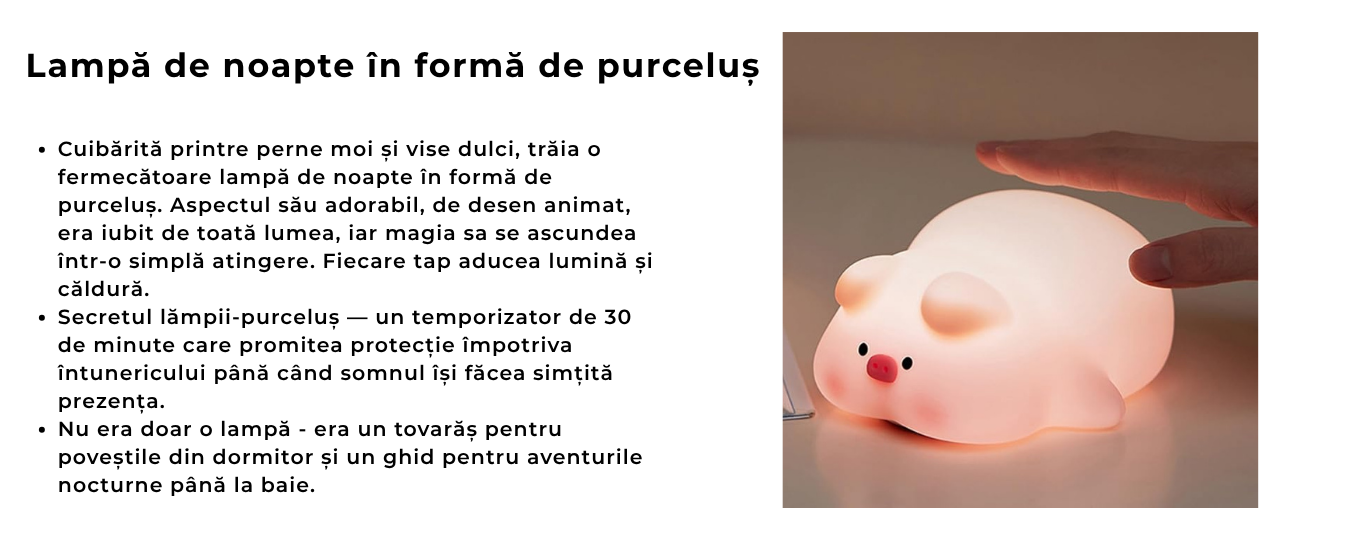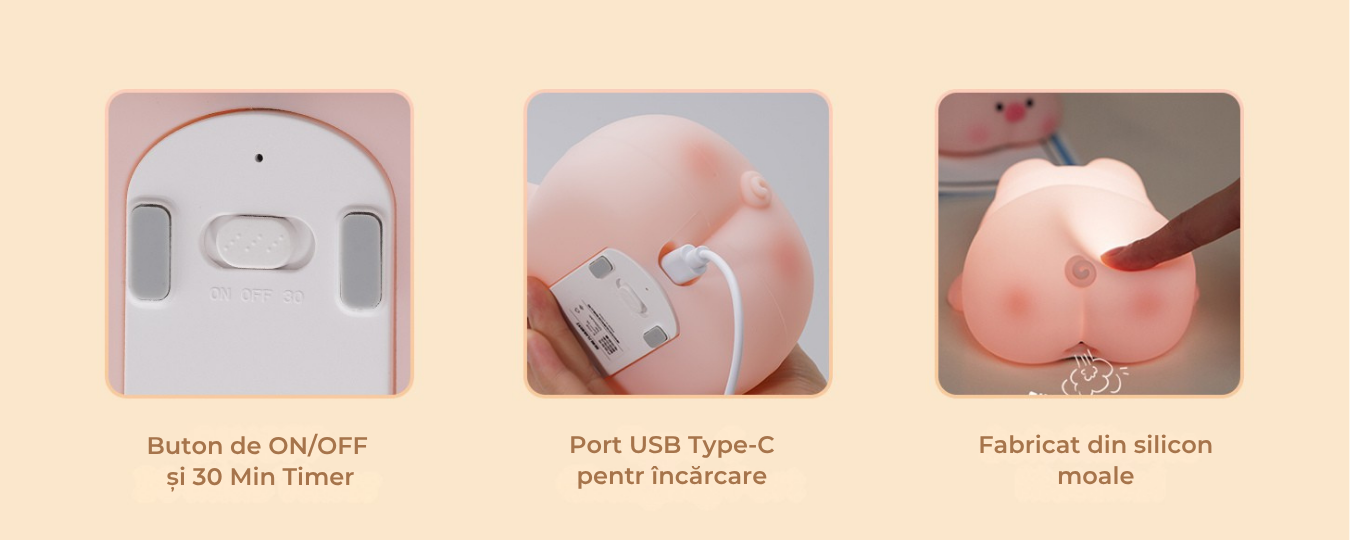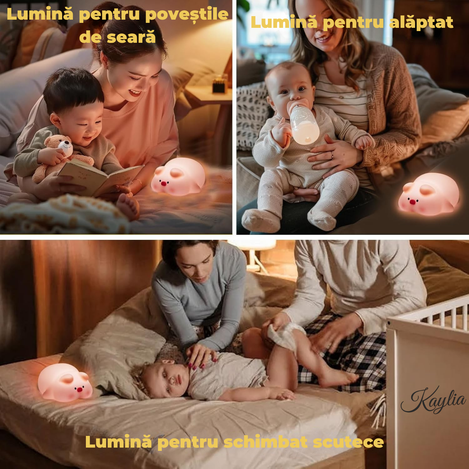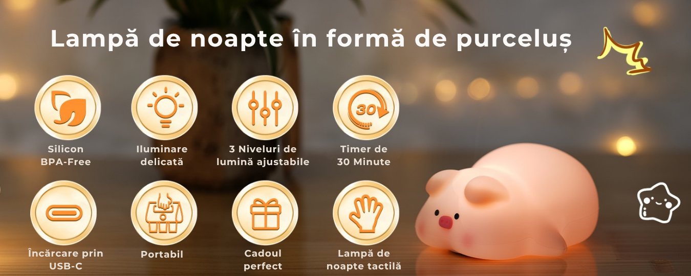 🐷 Moale, sigură pentru copii și ușor de folosit, oferă o lumină caldă și liniștitoare.