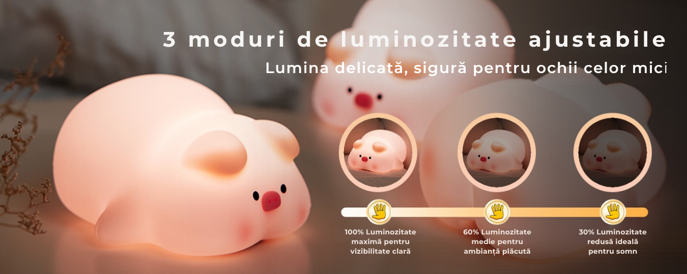 Lampă de noapte purceluș este adorabilă pentru camera bebelușului! Are 3 niveluri de luminozitate (scăzut / mediu / ridicat), perfecte pentru somn, alăptare sau ieșiri nocturne. Are lumină moale și materiale sigure și este ideală atât pentru copii, cât și pentru adulți.