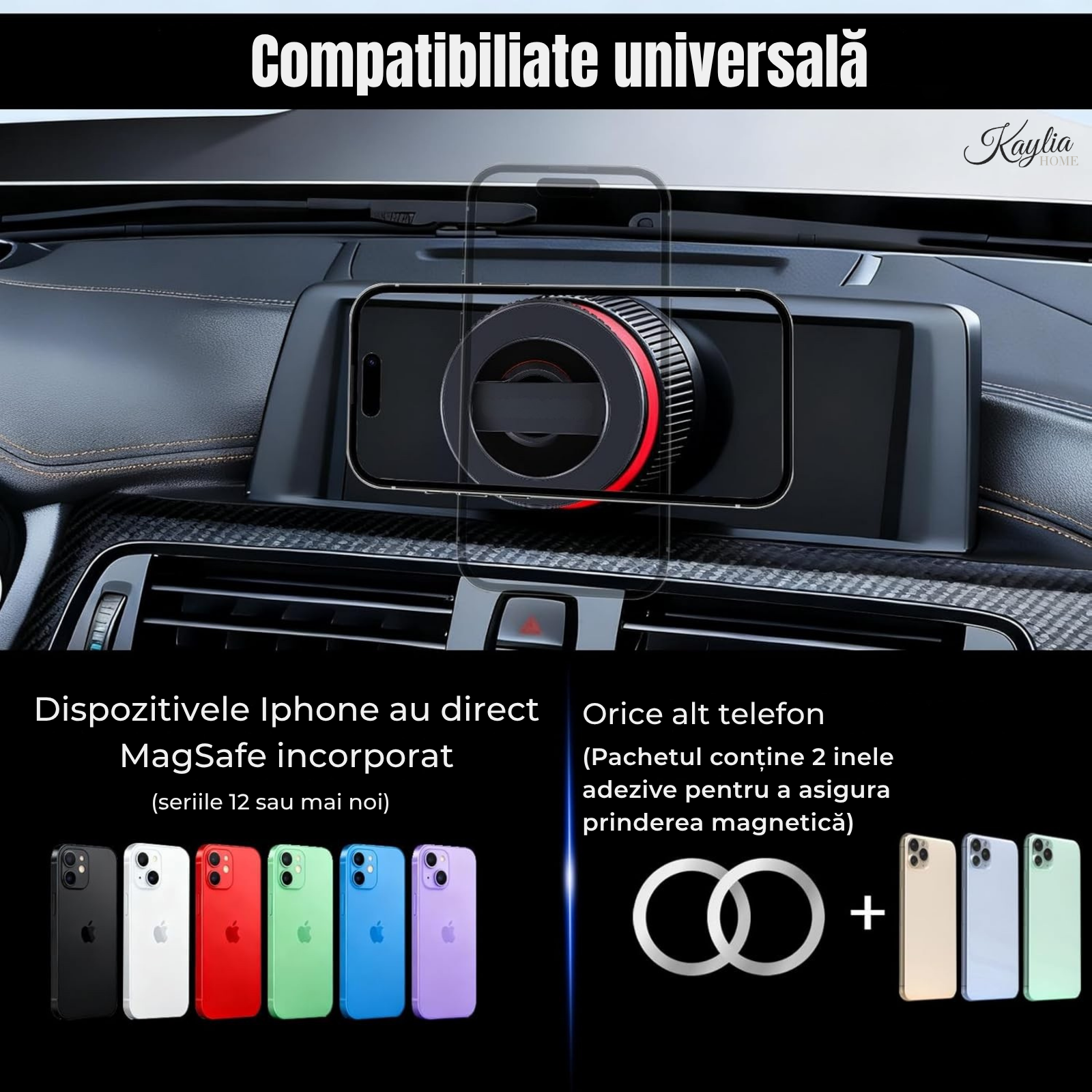 Fixare Magnetică: Compatibil nativ cu MagSafe (iPhone 12-16) sau universal prin inel metalic adeziv inclus.